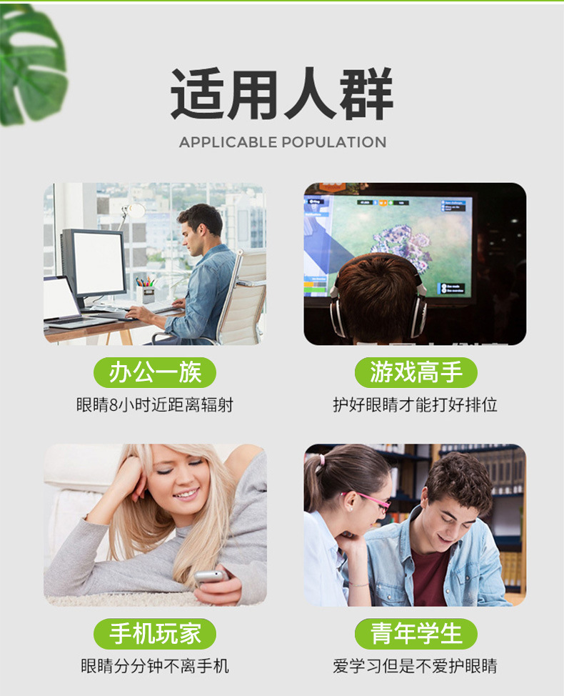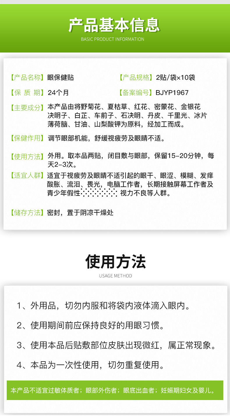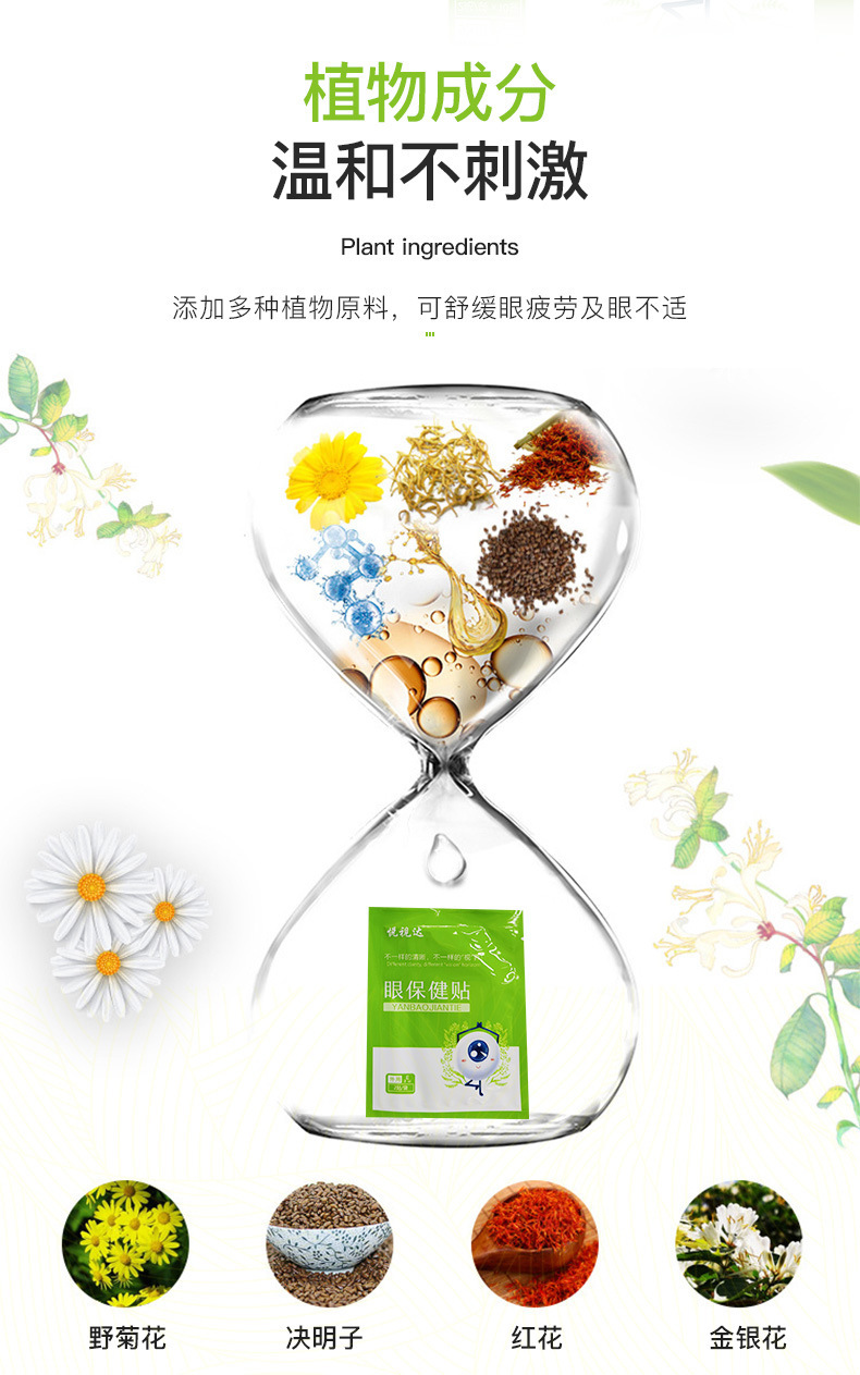 [產(chǎn)品名稱] 藍(lán)莓葉黃素護(hù)眼貼[產(chǎn)品說明] 本品是以藍(lán)莓、葉黃素、野菊花、夏枯草、金銀花、谷精草、決明子、白芷、車前子、丹參、石決明、丹皮、千里光、冰片、薄荷腦、甘油為原料,經(jīng)加工而成。[適宜人群] 適宜于學(xué)習(xí)、電腦工作者、頻繁使用手機(jī)者、長途駕駛員等用眼過度者、視疲勞及眼睛不適引起的眼干、眼澀、模糊、發(fā)癢、