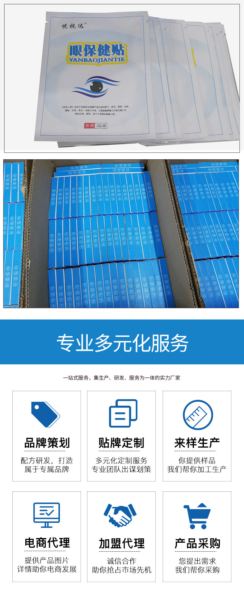 產(chǎn)品支持OEM貼牌定制代加工,公司資質(zhì)齊全,擁有多個注冊商標(biāo),除自有品牌外,同時具有強(qiáng)大的代加工業(yè)務(wù)承接能力。公司擁有貼劑、膏霜劑、凝膠劑、水劑、丸劑、粉袋、粉劑、眼貼等多條先進(jìn)生產(chǎn)線。公司研發(fā)出多種適用于實體店、終端、線上、線下、直播等途徑的爆款產(chǎn)品。公司為您提供商標(biāo)或代注冊商標(biāo),產(chǎn)品包裝設(shè)計,產(chǎn)品備案、廣告批文等一系列服務(wù),只要您一個電話,我們將為您提供細(xì)致專業(yè)的服務(wù),使您快速擁有自己的專屬品牌。